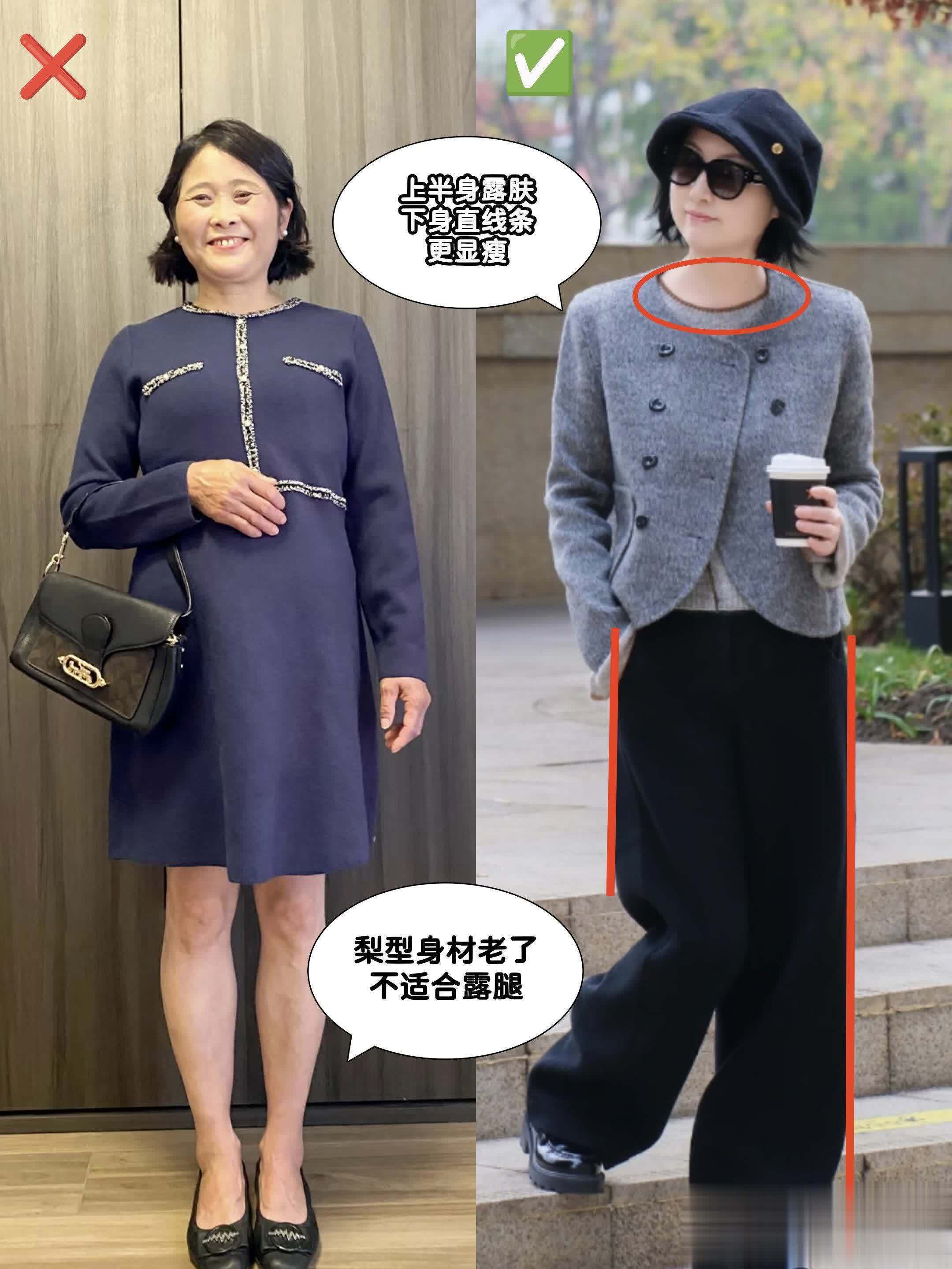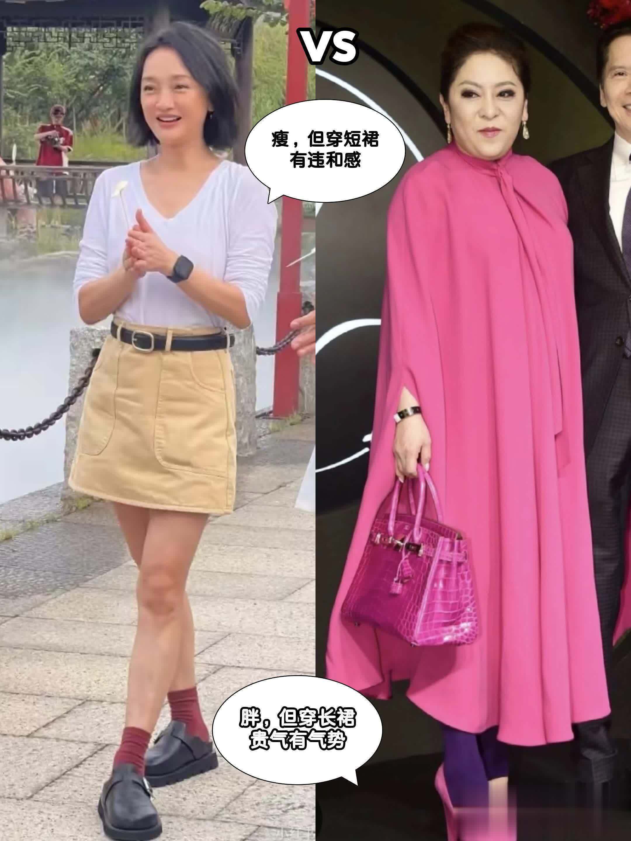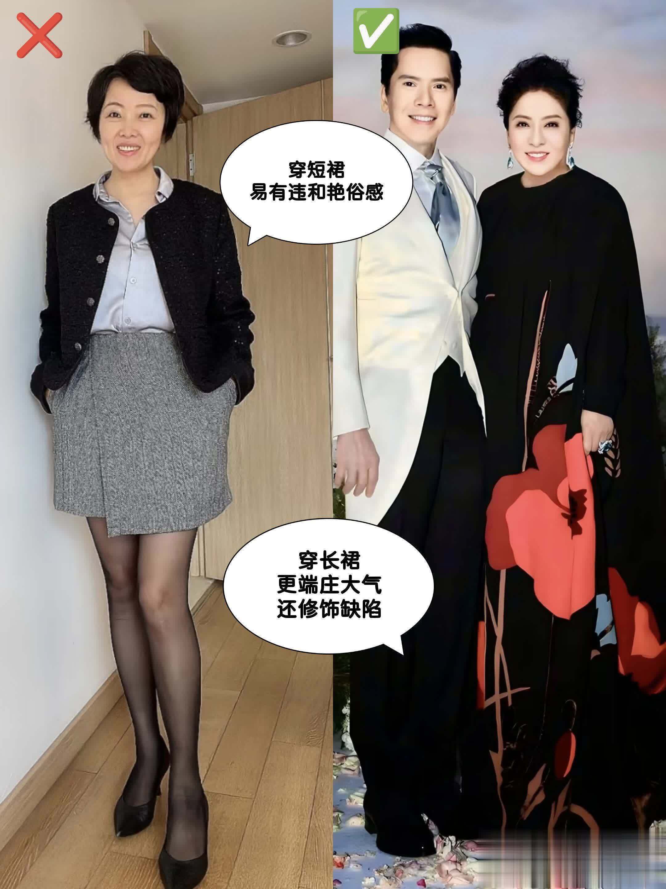 大家来看一下上面的对比就知道了,左边这位妈妈和向太也是差不多的年龄,穿短裙、黑丝的她因为把腿型不直和腿部肌肉松弛的缺陷露出来了,再加上性感的短裙和苍老的面庞也不搭,看上去就完全没有向太的得体高级感。