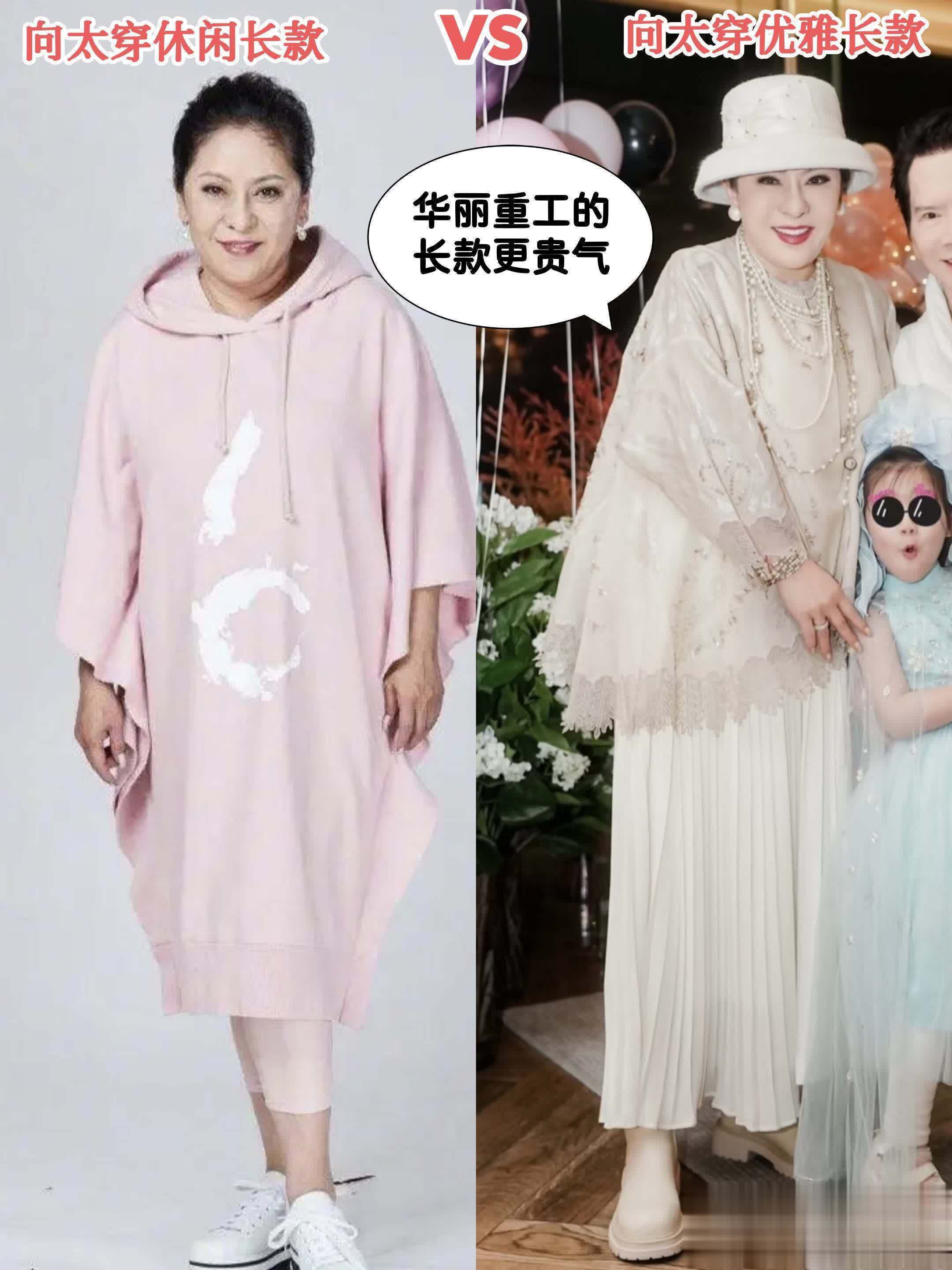 现在大家看到的向太,每次都是穿重工蕾丝、压褶长裙这种风格很华丽优雅的长裙,其实她以前也尝试过休闲的卫衣长裙,这不,邋遢的版型和胖身材一相遇,整个人就变得巨油腻老气!