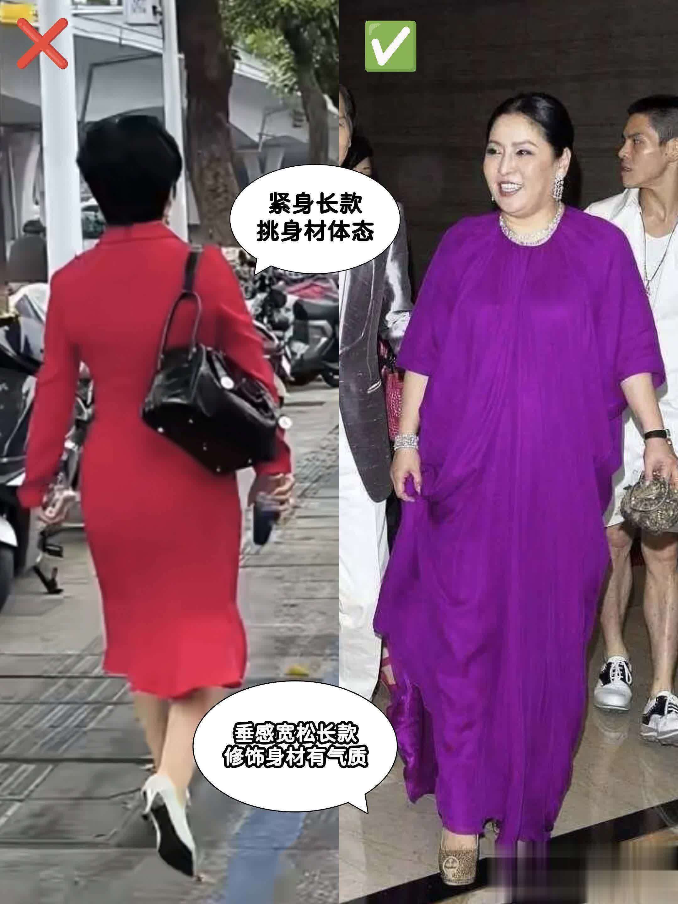 不知道大家发现没,向太的长外套和长裙超级多,但都没有一件是特别紧身的。先不说紧身裙很性感,大龄女性驾驭不住,你现在的身材就先劝退你了。