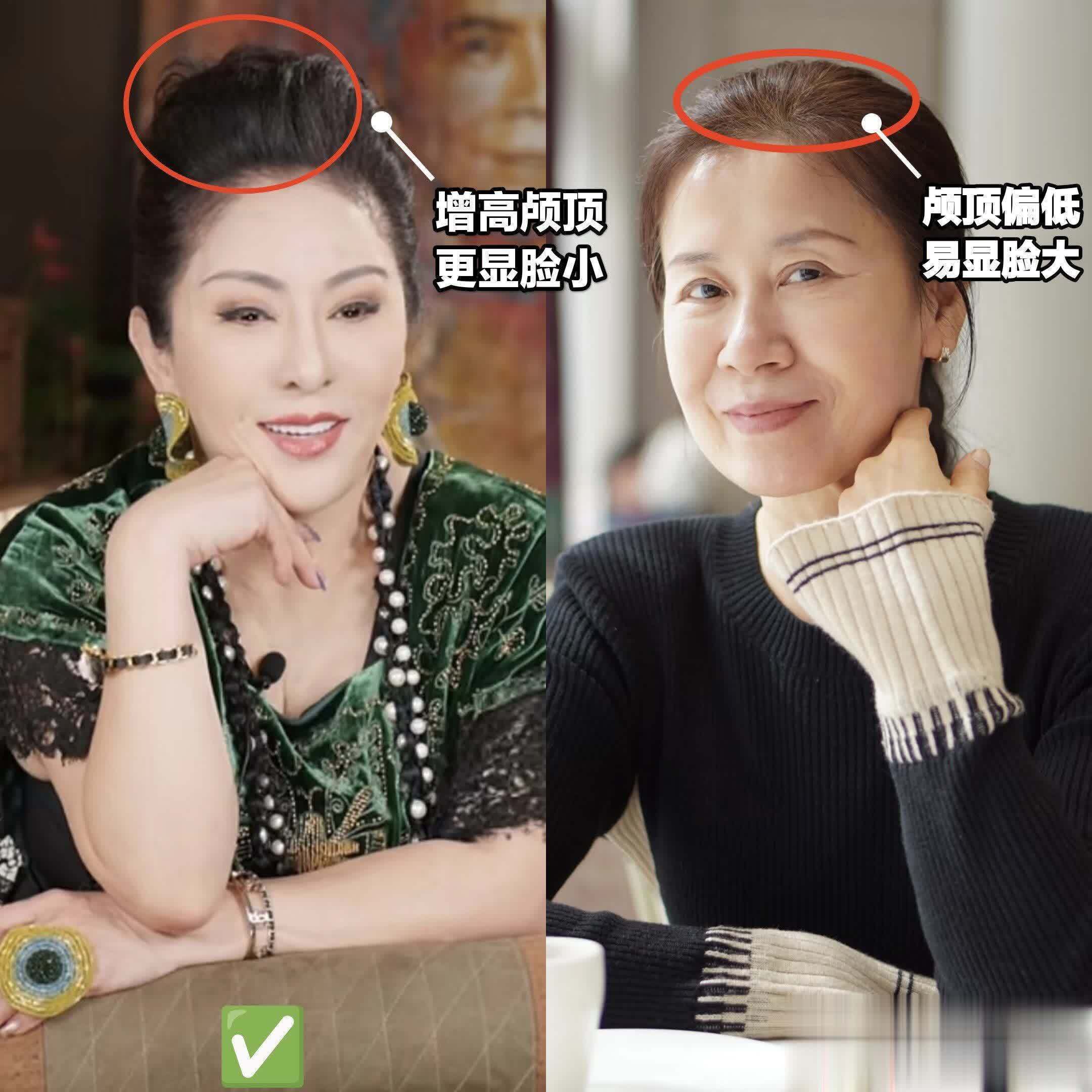 她的扎发是有种“头包脸”的感觉,头顶稍宽就会把我们的脸型衬得很窄,这样发福和发腮就不明显了;可以把前额发际线正上方的颅顶区垫高至约两倍眉尾到发际线的垂直距离,这样正面看上去就有倒三角的轮廓,脸一秒变小!