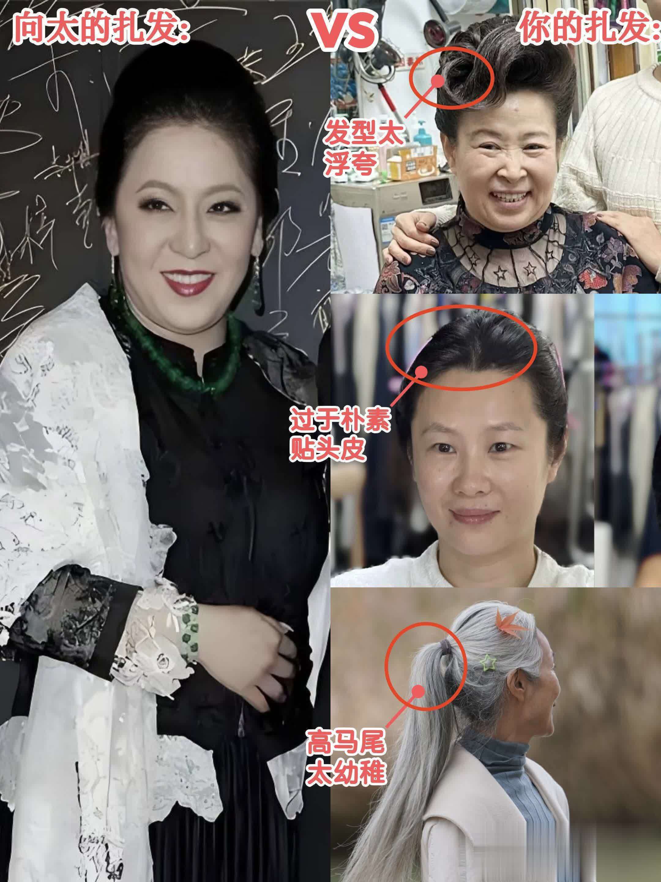 当然啦,向太的扎发能这么漂亮也是很有技巧滴,不信你回想一下平时见到的大龄女性的扎发,要么是把头皮勒得超级紧,要么就是不分年龄,还在扎高马尾、双马尾,真的太违和了!